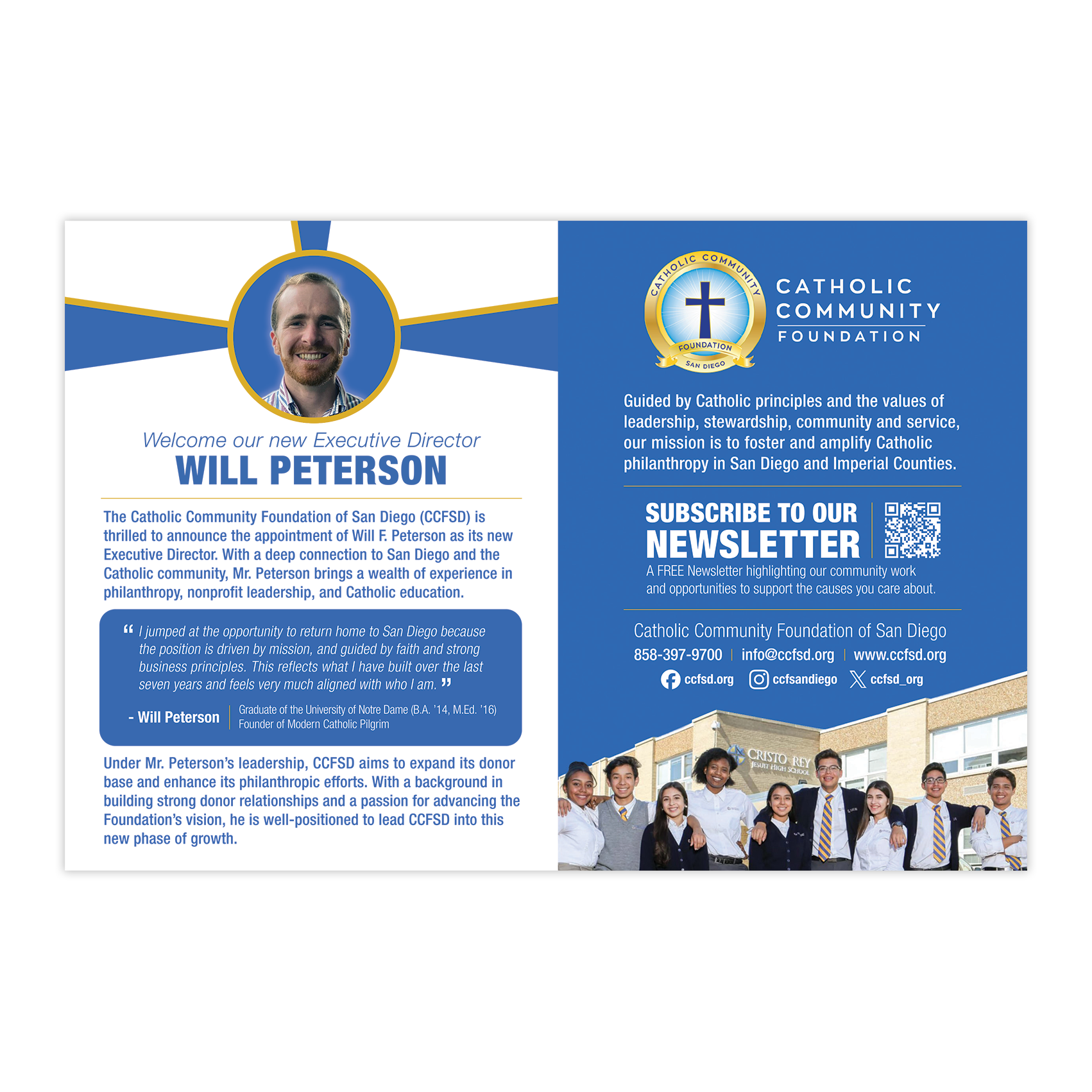 This mail-out design introduced a new Executive Director while re-engaging donors through clear messaging, thoughtful print layout, and a renewed emphasis on leadership and organizational values.